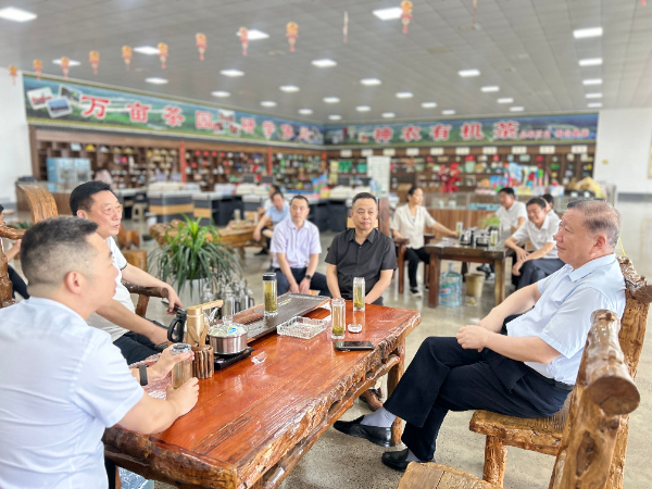 生产车间,详细了解了企业生产经营、产品开发、品牌打造、市场销售以及茶园种植、管理、采摘加工等情况,并召开座谈会。