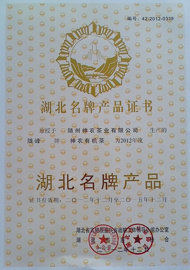 2012年12月神农有机茶被命名为2012年度湖北名牌产品