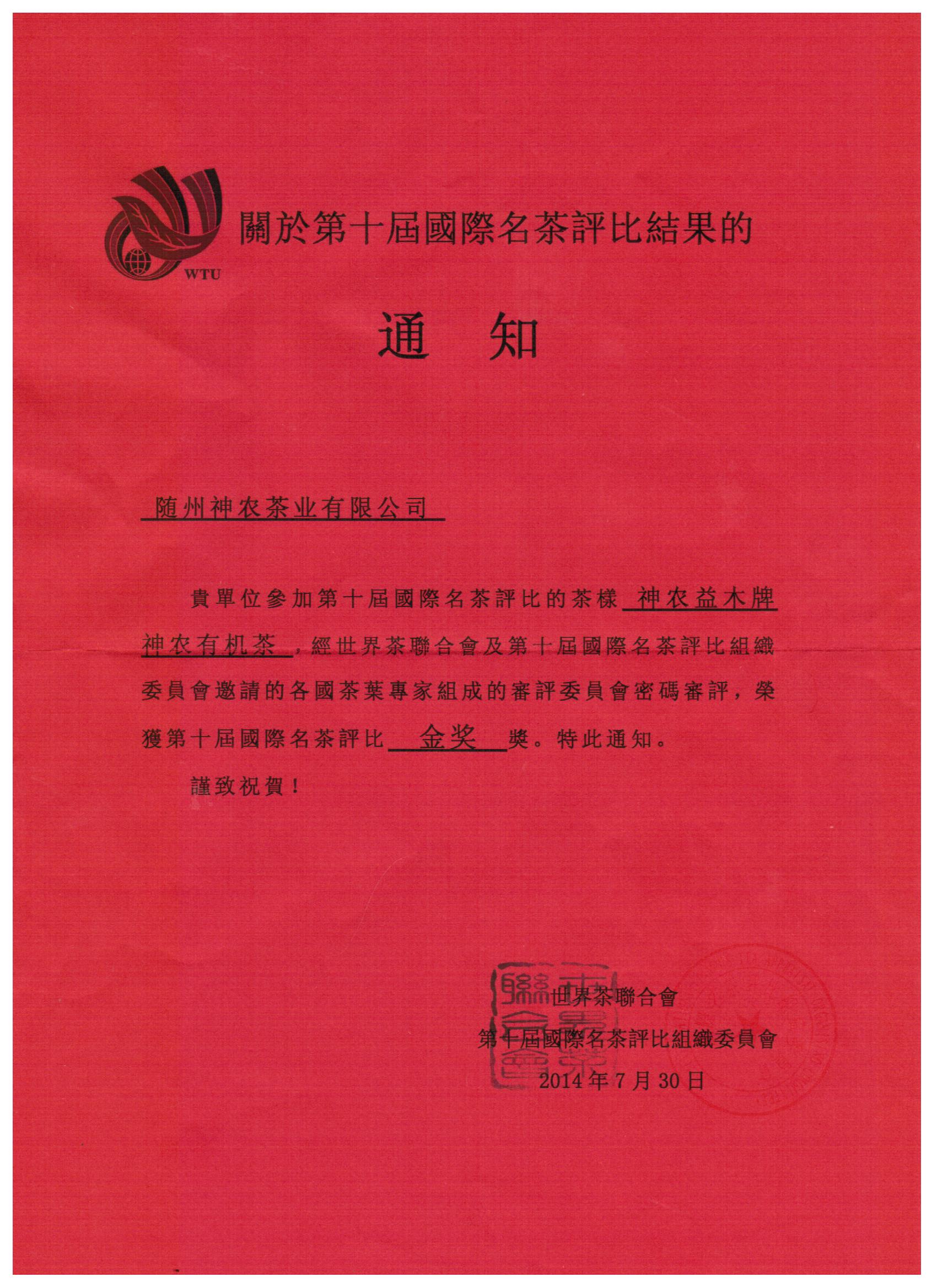我公司选送的"神农益木牌神农有机茶"再次荣获第十届国际名茶评比"金奖"