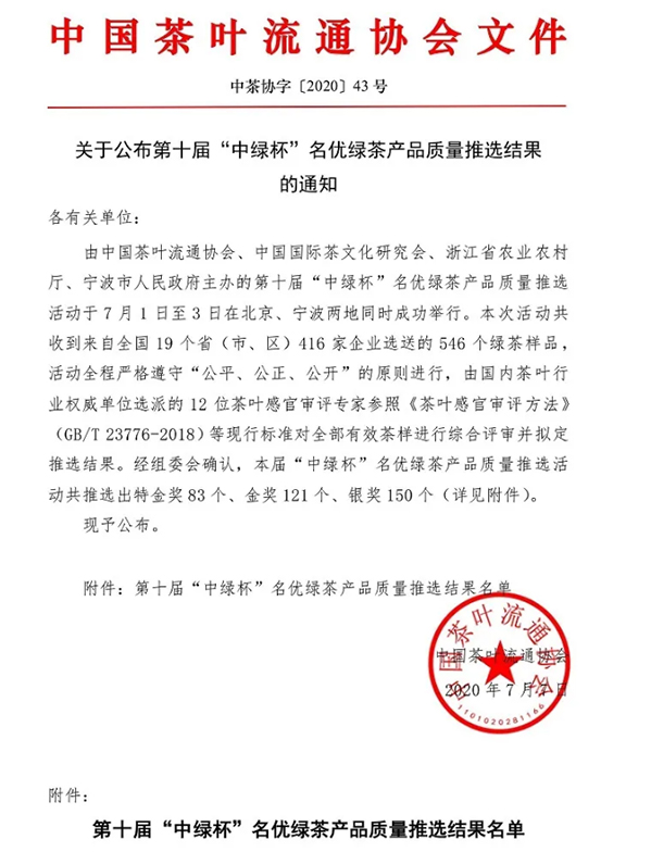 神农有机茶获第十届“中绿杯”名优绿茶产品质量金奖