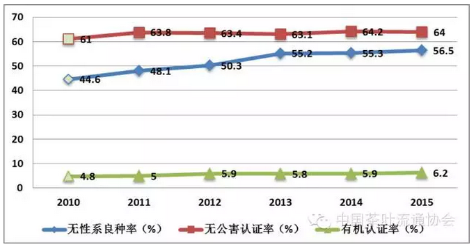 2、茶叶生产结构不断优化,提质增效明显。“十二五”期间,我国低老茶园改造和品种改良成果显著,茶园无性系良种率由“十一五”末的44.6%提升至56.5%。有机茶园、无公害茶园认证率分别增长1和3个百分点,呈现持续平稳发展态势(图3)。