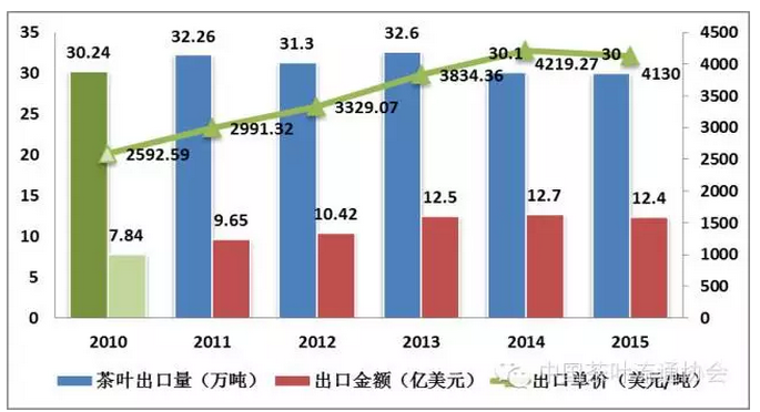 图9 2010-2015年我国茶叶出口量、总金额、单价走势变化