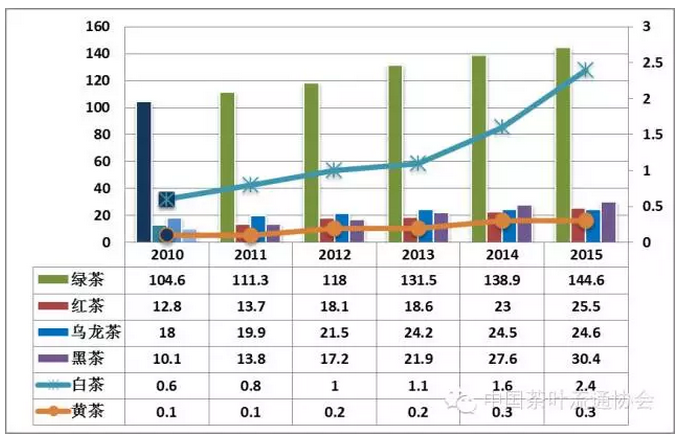 图4 “十二五”期间我国茶类结构变化(单位:万吨)