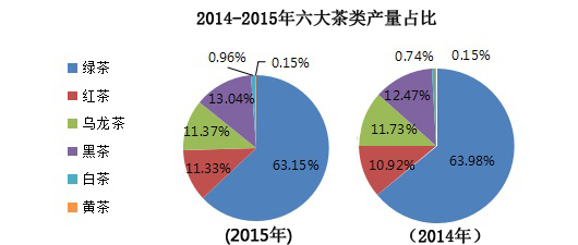 在六大茶类占比中,2015年绿茶、乌龙茶比例略有下调分别为0.84%和36%.白茶、红茶、黑茶比例都有不同程度的上升,分别为0.22%、0.41%、0.57%。