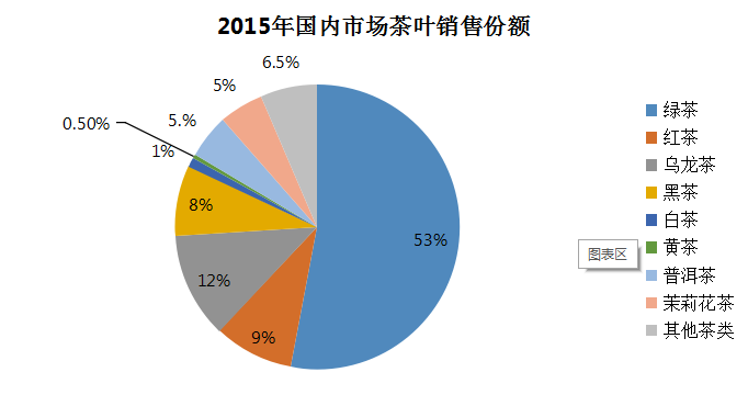 1、销量平稳增加,茶类份额保持稳定。综合推算,2015年全国茶叶销售总量继续缓增,预计为176万吨,增幅约为10%。茶类市场份额较往年变动不大,绿茶约占市场总量的53%;黑茶占比约为8%;红茶约为9%;普洱茶约占5%;乌龙茶约占总量的12%;产地集中的白茶和极小品种的黄茶,销量较往年基本持平,占比分别为1%和0.5%;茉莉花茶约占5%,其它茶类占6.5%。全国名优茶与大宗茶销量占比估计分别为43%和57%,较上年保持不变。