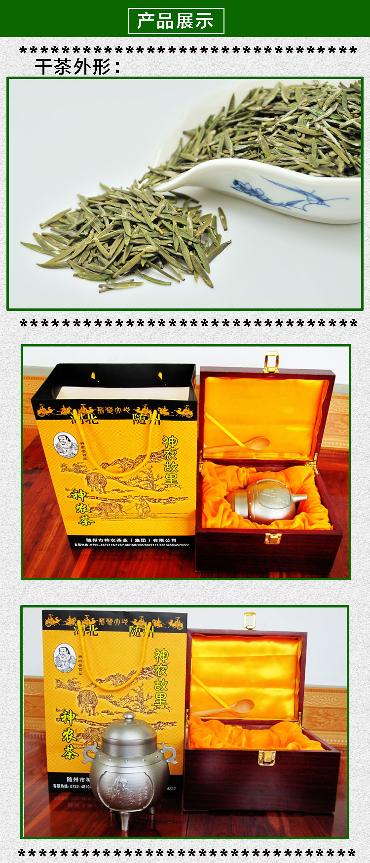 神农有机茶:其特点是条索挺直,芽头肥硕匀齐,银绿隐翠,清香高鲜,滋味醇和,汤色嫩绿明亮,冲泡时茶芽立于杯底,形似银剑竖立,亦像雨后春笋,蔚为壮观。由于该茶产地位于产地湖北随州位于中纬度季风环流区域的中部,地处长江流域和淮河流域的交汇地带,位于北纬31度19分至32度26分之单间,科学研究证明,北纬30度±2度,地带气温适宜,该产地所产茶叶能兼顾外形和内质,酚氨比在10左右,是优质绿茶的理想生长条件区域。
