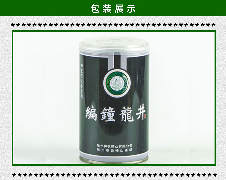 编钟龙井茶由随州神农茶业有限公司创制而成。该茶外形扁平挺秀,其色泽绿翠,鲜艳有光,香气清高鲜爽,滋味甘醇,汤色清冽如玉,素以“色绿、香郁、味甘、形美”四绝著称,实乃茶之上品。细品其韵味犹如古老而神秘的编钟音律,故名“编钟龙井茶"。